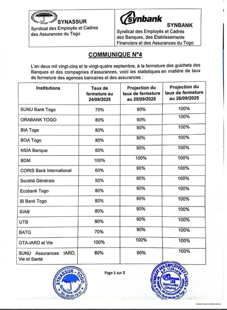 Les syndicats des banques (SYNBANK) et des assurances (SYNASSUR) ont déclenché une grève de 72 heures, après l’échec des négociations avec les employeurs. Cette paralysie se poursuit jusqu’au 26 septembre, agissant fortement sur ces secteurs clés.