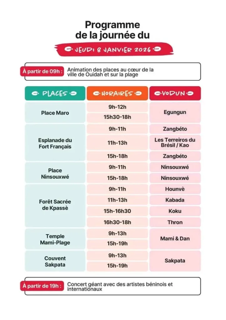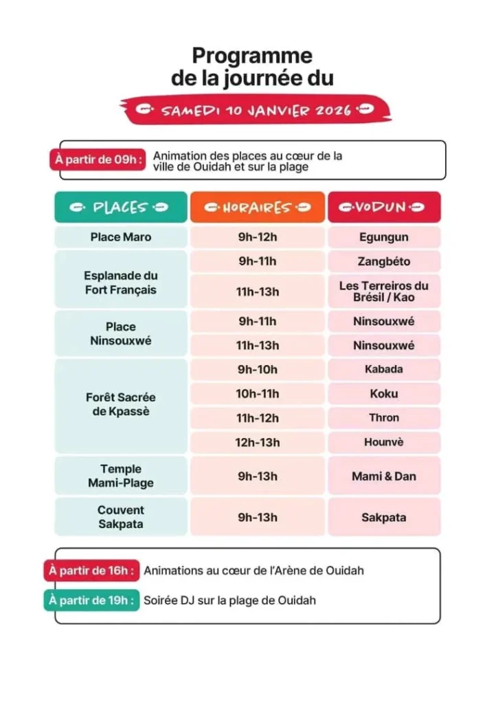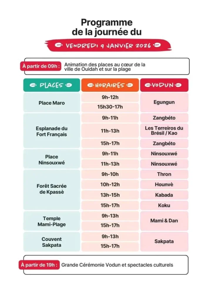 Le gouvernement béninois a rendu public le programme officiel des Vodun Days 2026, un événement culturel et spirituel majeur qui se tiendra du 8 au 10 janvier 2026 à Ouidah, haut lieu de l’histoire et des traditions vodun.