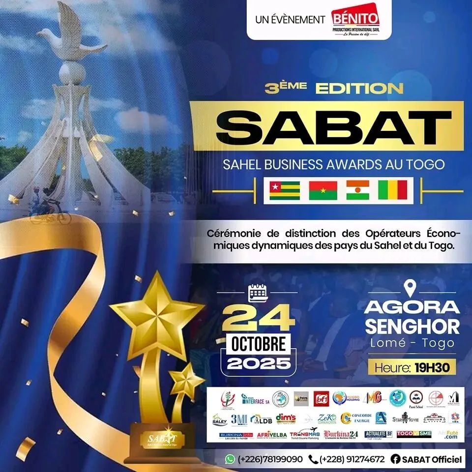 Le vendredi 24 octobre 2025 se tiendra à Lomé, à l’Agora Senghor, la 3ème édition du SABAT (Sahel Business Awards au Togo), un événement dédié à la reconnaissance des opérateurs économiques dynamiques des pays du Sahel et du Togo.