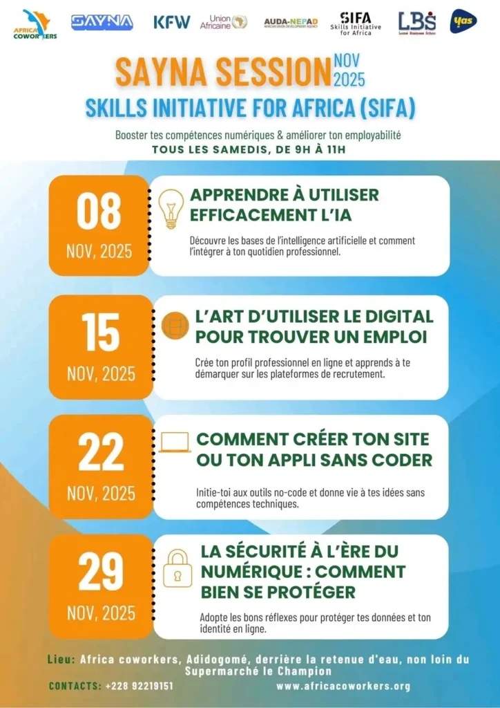 Africa Coworkers, en partenariat avec SAYNA et SIFA, annonce la tenue des SAYNA SESSIONS pour tout le mois de novembre 2025. Cette série de formations gratuites et intensives est conçue pour propulser l’employabilité et l’expertise numérique des jeunes, étudiants, entrepreneurs et de tout curieux du digital.